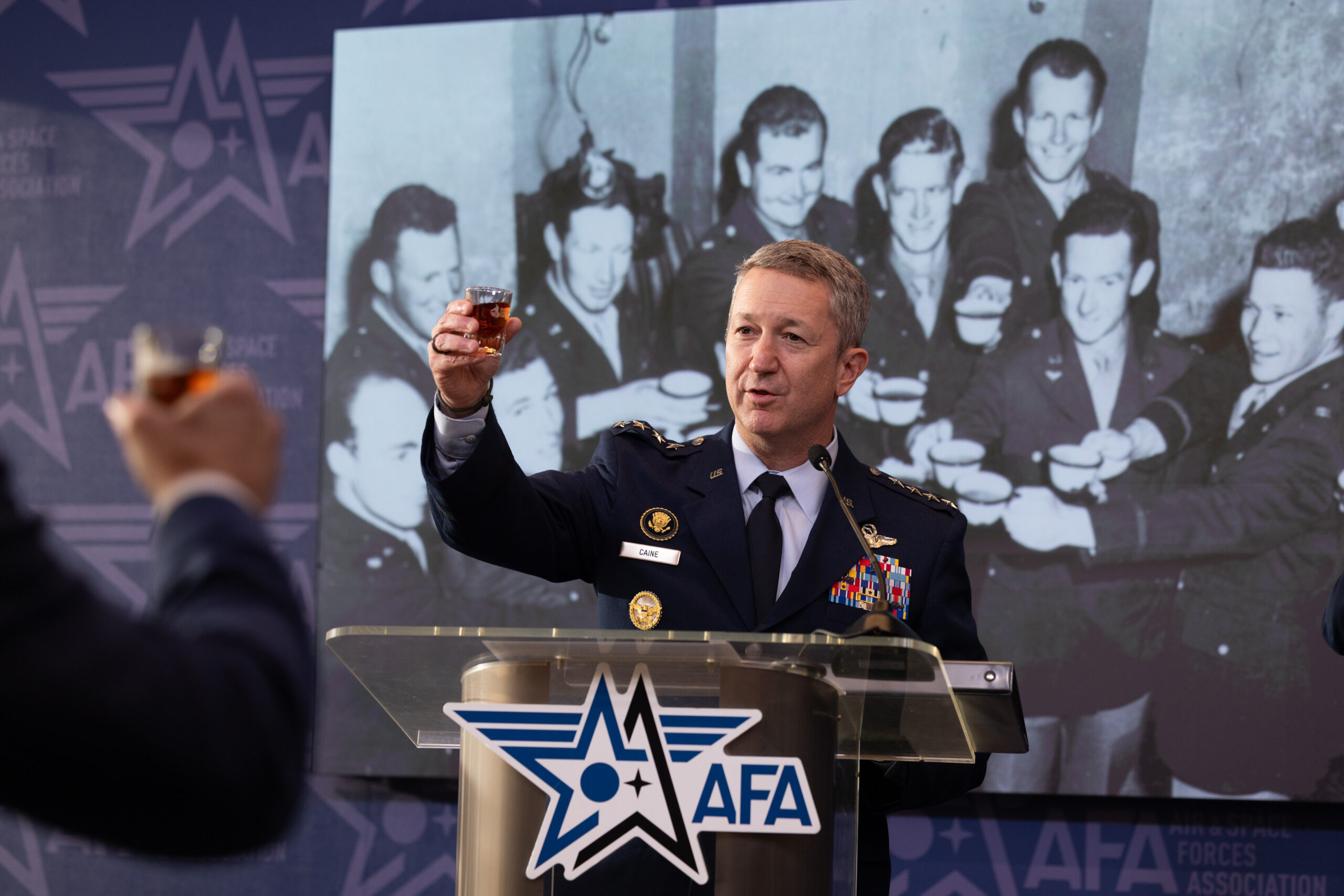 During the 2026 memorial toast, shots of Hennessy Cognac—the Raiders’ traditional drink of choice—were raised in unison across the country from Arlington and Dallas, Texas, to Airmen and Guardians serving on the forward-deployed front lines. AFA chapters and Air Force, Space Force, and Civil Air Patrol (CAP) units worldwide joined the ceremony via a livestream from AFA Headquarters, led by toastmaster Gen. Dan Caine. “To those who have gone,” Caine said, raising his glass, as the audience echoed the toast. The moment resonated beyond the in-person ceremony, as participants around the globe shared images and greetings from their own observances.