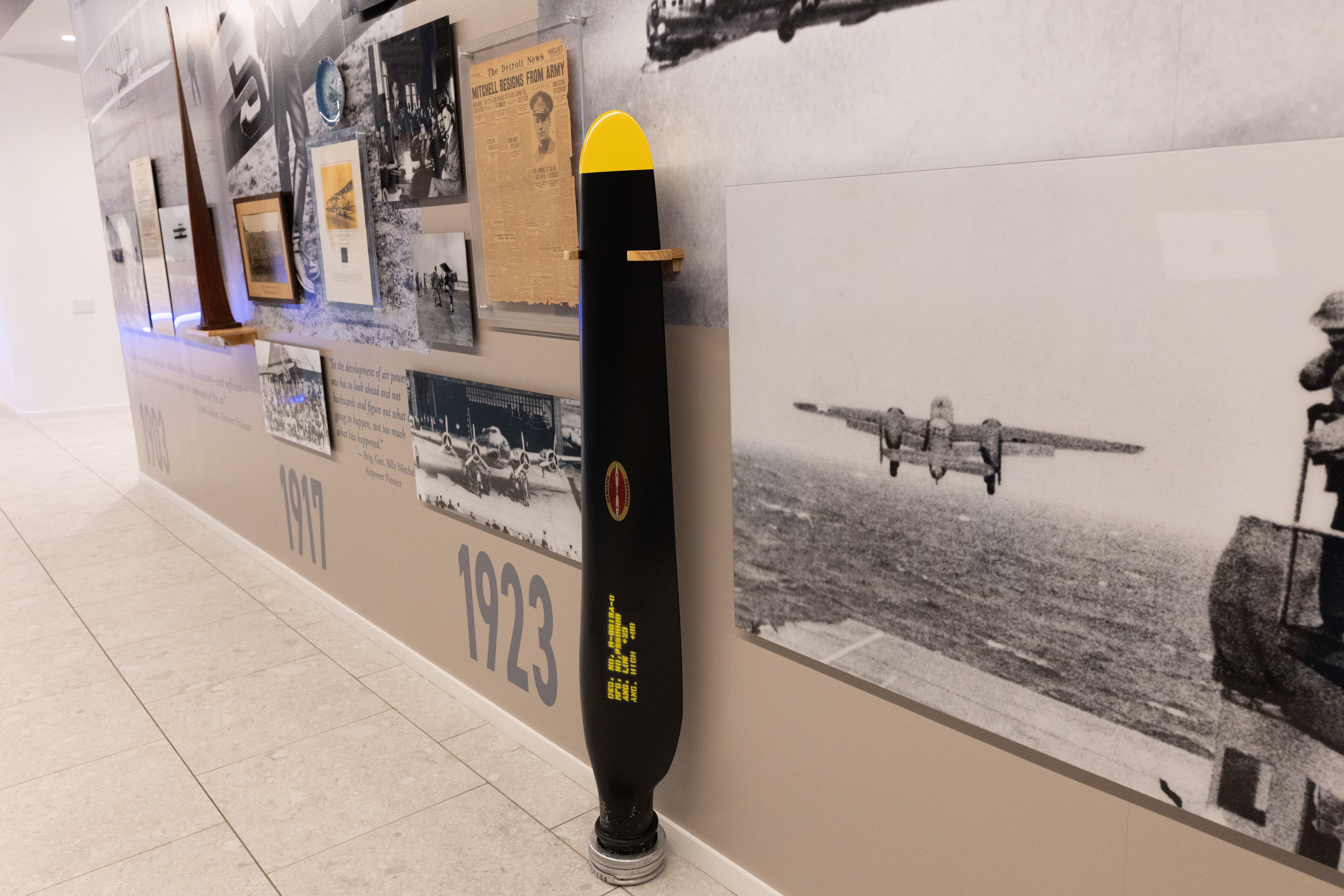 Historic photos of figures like Capt. Eddie Rickenbacker, Gen. Hap Arnold, Gen. Carl Spaatz, Gen. Ira Eaker, Gen. Curtis LeMay, and operational aircrews, along with images of aircraft, various quotes, and artifacts guide viewers through milestone events of U.S. Air Force history. It’s a tribute to the continual evolution and technological progress that define American airpower.