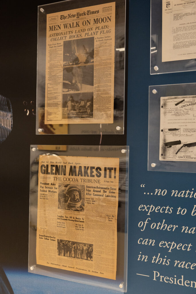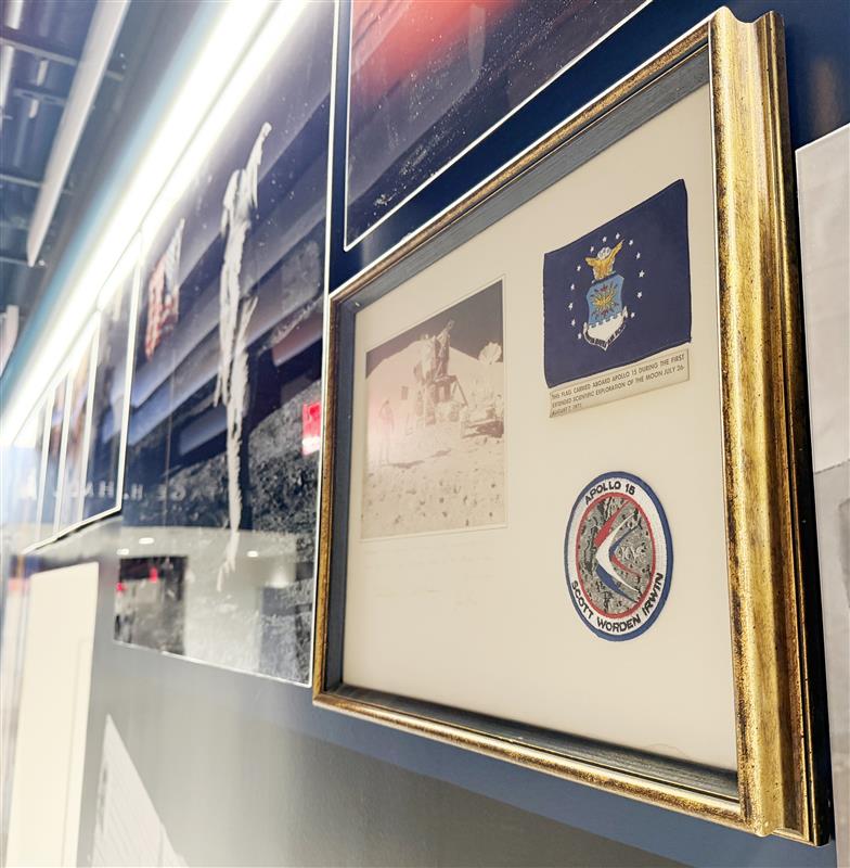 To enrich the historical depth and authenticity of the exhibit, Birkey contributed original artifacts and archival materials that connect visitors directly to the eras being represented—including a World War I propeller blade, a piece of a B-17, as well as control wheels from a B-47, B-52, and C-5. Items from AFA’s collections were also highlighted, like original newspapers covering the early days of the space race, an Apollo 15 mission patch that was actually flown to the moon and back, as well as key documents that tie to the founding of the Space Force. Deptula also added some very unique historical pieces—including a map used on night one of the Desert Storm air campaign and an MQ-1 propeller. Combined, these artifacts, dozens of images, and quotations from air and space leaders yields a narrative structure and set of high impact visuals that reflect the evolution of airpower and spacepower over time.