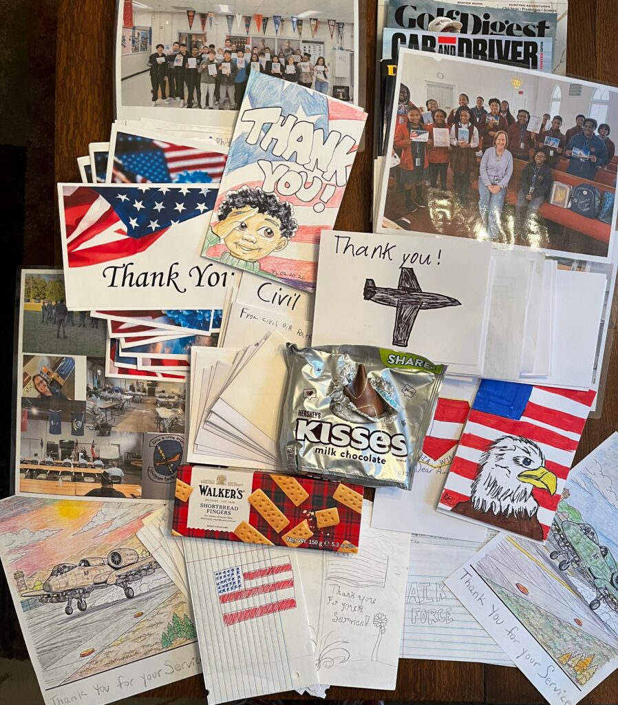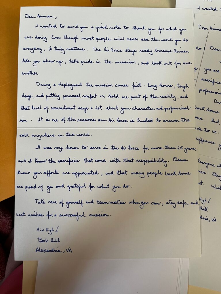 Some of the handwritten cards read: “Dear Airman, I thank you dearly for being of service to our country and I hope you will find comfort being without your family. I hope God will be with you while you are on your deployment”; “I wish you a safe return, really, from the bottom of my heart. Thank you for your service. You are a hero”; “We love you guys so much! Stay safe and make good choices. Thank you for your service to our country.”