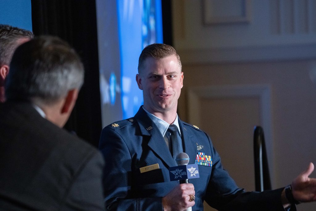 Maj. Ben “Irish” Coffey, the Chief of Air Staff at the 48th Fighter Wing, speaks on the “Dangerous Game: Lessons from the April 2024 Drone Attack in Israel” panel at AFA’s 2025 Air, Space & Cyber Conference. Photo by AFA staff.